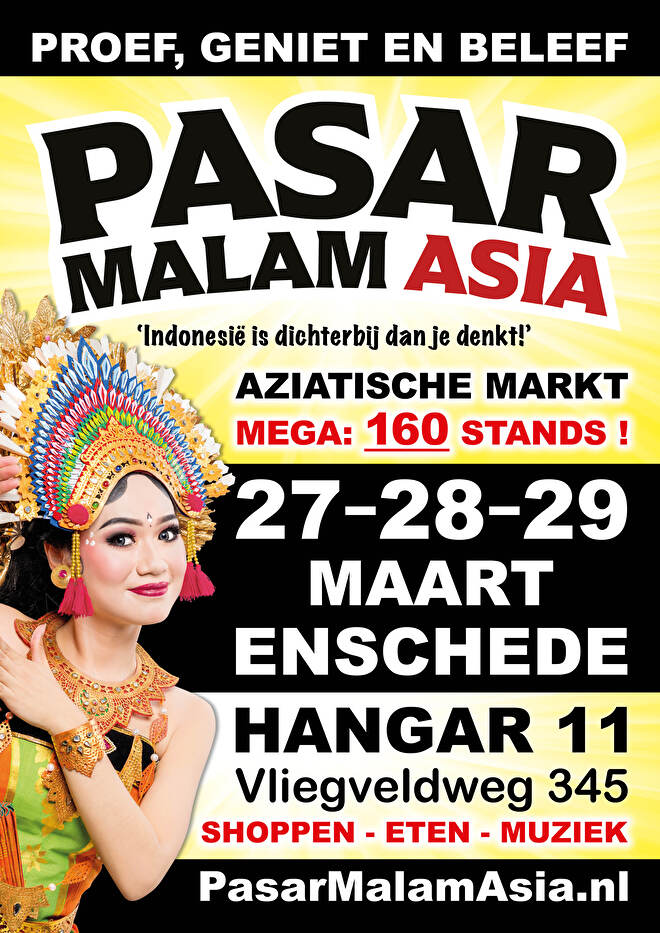 | Vrijdag | 27 maart | Pasar Malam Asia | Vliegveld Twente | Enschede | 13:00 - 22:30 |