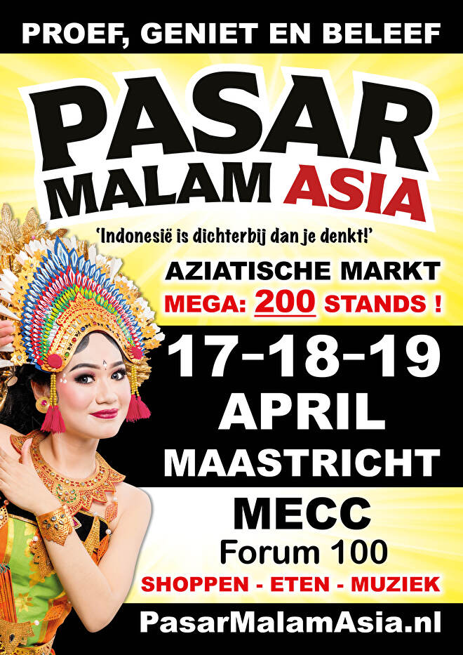 | Vrijdag | 17 april | Pasar Malam Asia | Mecc. | Maastricht | 13:00 - 22:30 |